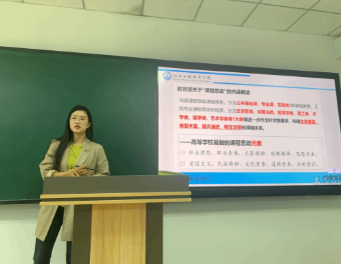 马秀丽老师结合外出学习的心得体会,做了题为《立德树人有道 春雨润物无声》的课程思政汇报。马老师首先重点分享了西安交通大学周屈兰教授以《燃烧学》为例的课程思政实践。其次,结合内容谈了国际经济与贸易专业主要课程思政实践:比如讲到中国由贸易大国向贸易强国转变, 以此出发,可以引导学生讨论青年学生要有怎样的历史使命感,要有怎样的责任担当;比如讲到国际市场营销,做市场分析时,告诉学生坚持“四个自信”的同时,也要尊重他国文化和贸易习惯;比如讲到寻找国外客户时,要有风险意识,要坚持国际利益高于一切,重视对客户的资信调查等。