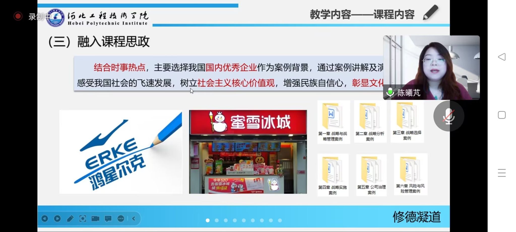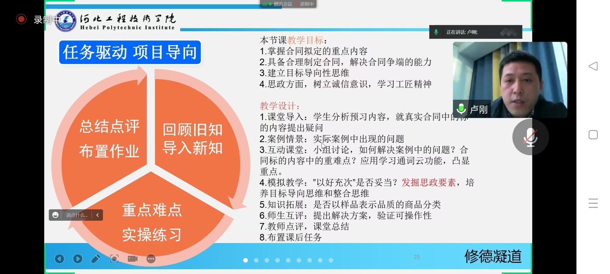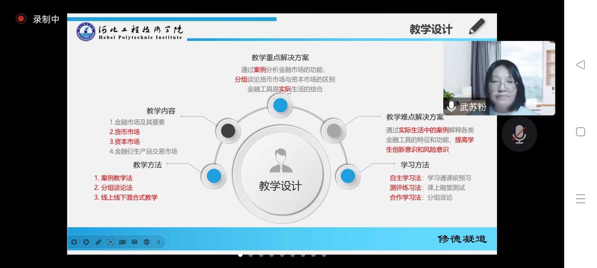 决赛由线上说课、创新教学成果汇报两部分组成。参赛教师们激情饱满,积极探索智慧教育新形态,运用先进的教学理念,优化教学目标,设计教学内容,创新教学方法,改革考核方式,充分展现了学院教师对待教育教学的热忱,以及专业的教育教学能力,获得了观摩教师们的肯定。