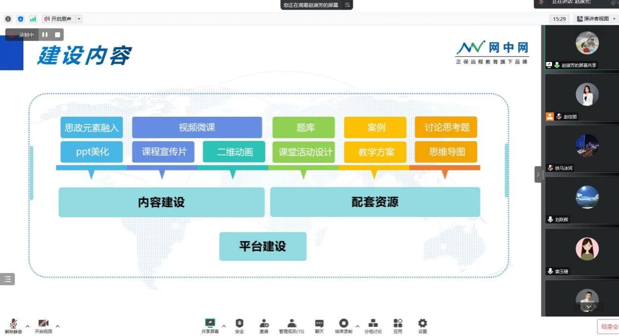 姜玉婕首先结合学院的近期工作部署,对一流课程建设进行了说明,并对正保网中网公司的基本情况和服务做了介绍。然后正保金课咨询师赵书芳对课程建设运行等具体内容做了详细的讲解。