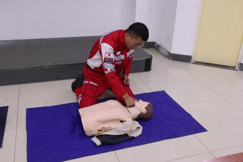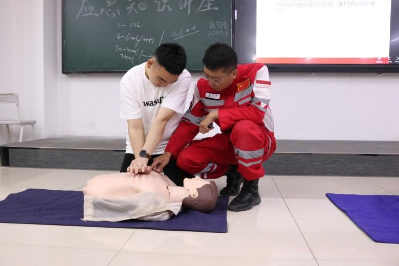讲座开始,周志伟救护员通过几则新闻向大家讲解了突发情况时对伤者进行应急救护的重要性。同时,他用采用生动形象的方式让同学们深入了解各种常见急症的应对方法,以及心肺复苏、止血包扎等关键技能的操作要点。实操展示环节,周志伟救护员向同学们亲自示范了心肺复苏、止血、包扎等急救操作,并邀请了部分同学上台实操,同学们积极参与实操,在周志伟救护员的指导下亲身体验应急救护的实际操作,进一步巩固了所学知识。亲身体验急救过程更是让同学们近距离感受到应急救护的实际操作过程,激发了他们的参与应急知识学习热情。