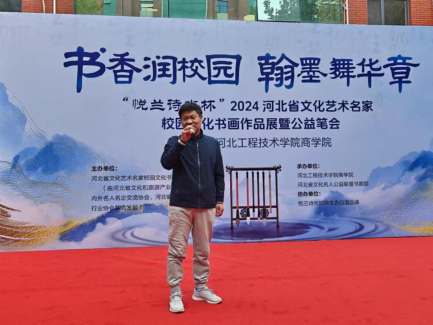 河北省文化名人公益联盟书画院名誉院长吴浪代表书画家致辞,他表示,非常感谢组委会给大家提供的可以和师生零距离接触的机会,很高兴能够参与此次书画展览和公益笔会,为助力校园文化建设和美育教育实践尽自己微薄之力。