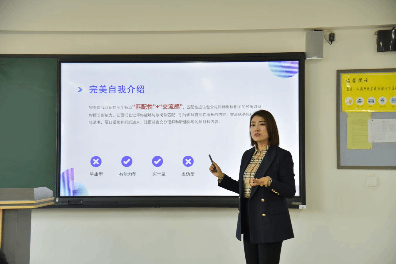 在307教室,张怡静讲师从着装、面试表现等多个核心方面切入,着重对不同行业面试着装的规范与禁忌进行了细致入微的讲解,并现场指导台上学生的站姿、坐姿以及表情管理,帮助同学们深入了解面试前需要做的各项准备,使他们在面试时能够充分展示自身优势,增强面试自信。在问答环节,同学们积极提出“面试时怎样巧妙回应自身缺点”等问题,张老师都给予了耐心且专业的解答。