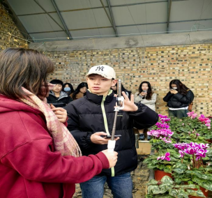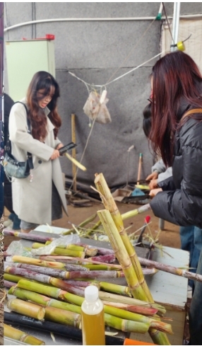 塔元庄生态园位于石家庄北侧15公里,习近平总书记曾经三次视察塔元庄。顶着凛冽的寒风,飘着冬日的小雪, 学生到达活动现场。首先由北京杯子传媒总经理房新雨向同学们详细介绍了拍摄农产品视频的技巧及注意事项,石家庄东区供销有限公司总经理曹晓磊带领学生们参观了甘蔗、多肉植物和仙客来种植大棚。同学们亲身体验了削甘蔗皮、榨甘蔗汁等农家活动,并大胆尝试了创意短视频的拍摄。在专业团队的指导下,同学们热情参与让整个直播活动充满了青春活力。