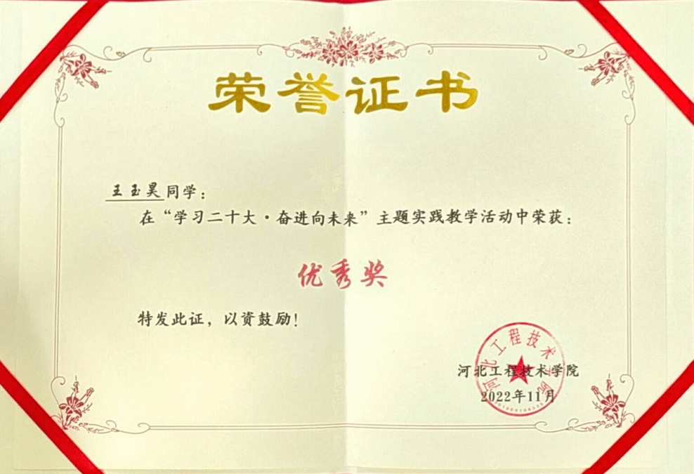 在思想上,他是坚定的青年马克思主义者。自入学以来,王玉昊就以一名党员的标准严格要求自己,他旗帜鲜明,立场坚定,坚决拥护中国共产党的领导,遵守学校各项规章制度,按时参加“青年大学习”团课学习,积极参与团日活动。与此同时,他主动参与思政课课外实践,在校期间曾作为班级代表到校外进行实践,做到马克思主义理论与实际相结合。他在思想上积极进取,要求进步,作为学生中的先进青年,他不忘初心,牢记使命,凡事走在前面,充分发挥了先锋模范作用。