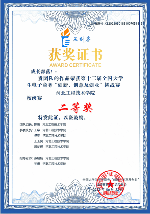 图9 第十三届大学生电子商务“创新、创意及创业”挑战赛校赛“二等奖”