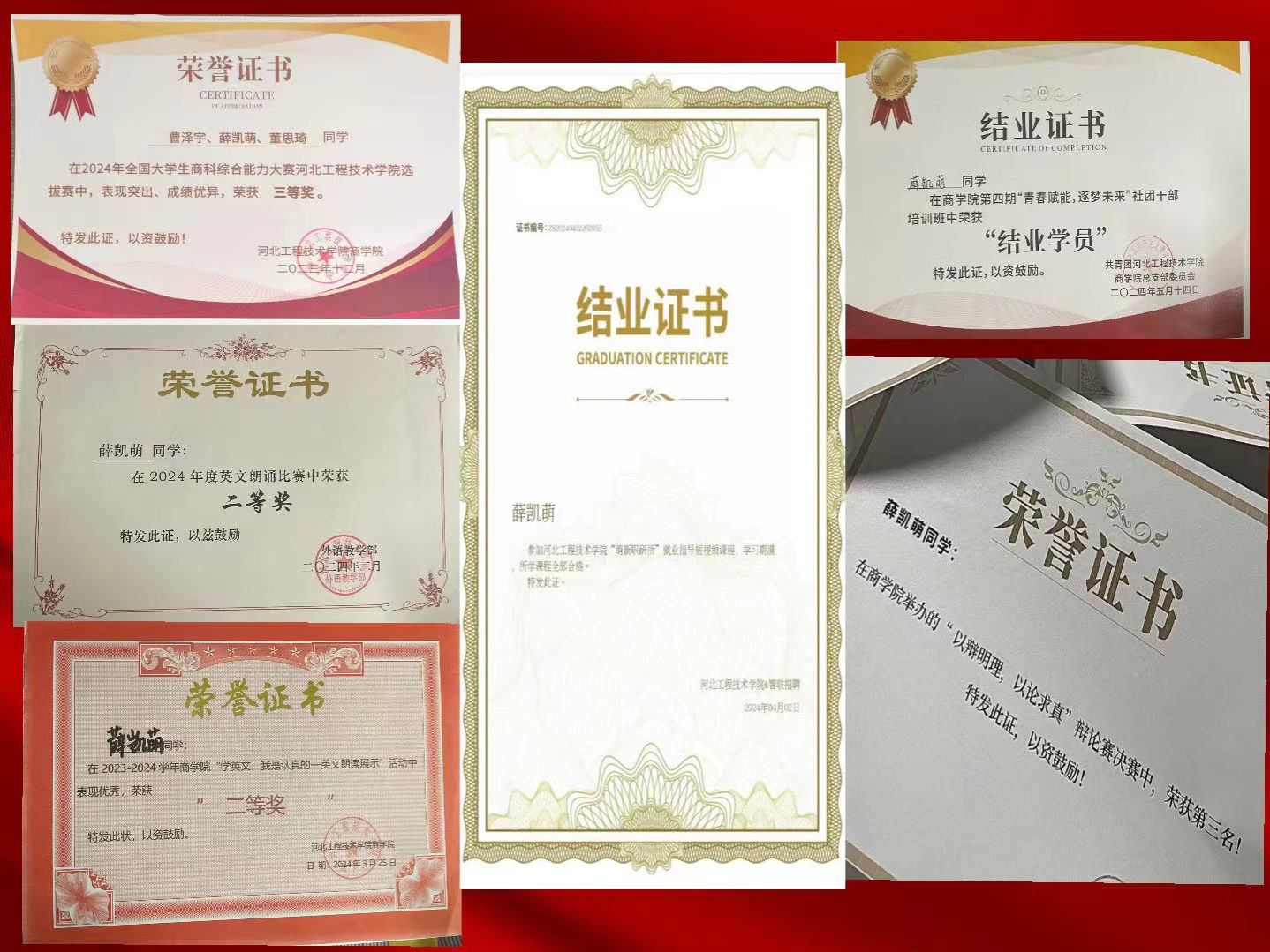 薛凯萌积极参与校园公益活动,并在实践中成长。参与社团“心随影动,禁毒防艾永不息”志愿活动,录制禁毒防艾宣传视频,增强了公众的禁毒防艾意识,为创建健康、安全的社会环境做出了贡献。参与“血脉相连,爱满人间”志愿活动,逐班进行知识宣讲,提高了公众对无偿献血的认识、在鼓励更多人参与以及培养社会责任感方面取得了显著成效,为社会的健康和福祉做出了重要贡献。参与寸草心敬老爱老志愿服务活动,进入松鹤园敬老院慰问老人,提升了老年人的生活质量,也弘扬了尊老、敬老、爱老的传统美德。参与华北军区烈士陵园扫墓活动,缅怀了革命先烈,在宣传传承红色基因、增强爱国主义精神等方面取得了显著成效,为社会培养了具有历史使命感和社会责任感的公民。