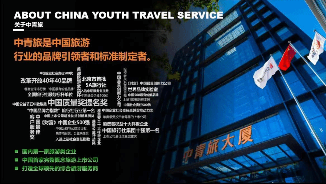 中青旅控股股份有限公司是一家以旅游、高科技的投资、房地产等为主要业务的公司。公司经营旅游产品服务、企业会展服务、酒店业、景区经营、IT产品销售与技术服务、房地产销售、房屋租赁等。2010年获中国会议产业大会颁发的"华表奖-2010年度中国最佳绿色会议公司"奖等多个奖项。公司自上市以来积淀了巨大的品牌价值,在同行业中具有很高的知名度。