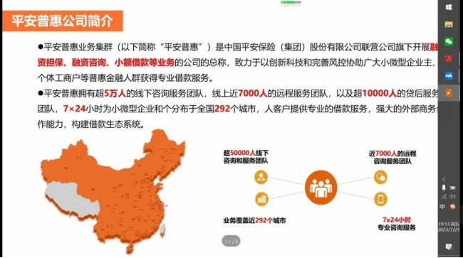 首先是平安普惠公司负责人集磊向同学们进行公司介绍。平安普惠是中国平安保险(集团)股份有限公司联营公司旗下开展融资担保、融资咨询、小额贷款等业务的公司的总称。 目前,平安普惠业务覆盖全国300余个城市,已累计服务客户超1100万,帮助他们获取超过1000亿元的贷款。公司宣讲人讲到平安普惠是中国平安旗下成员,专注于提供个人和小微型企业消费金融贷款服务,作为目前中国最大的消费金融品牌,保证可以为每一位公司员工提供高额的薪资及优厚的福利待遇。新入员工基薪也达4000元/月。
